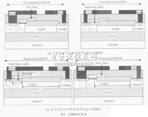 由于负电源供电的电平位移电路结构的改变,应用于正电源的常规nLDMOS和pLDMOS不能满足该电路结构要求。在正电源供电的电平位移电路中,由于pLDMOS的源端接高压电源,其栅源需要承受高压,所以pLDMOS采用了厚栅氧的结构,如图2(a)所示。在使用负电源的电平位移电路结构中(图1(b)),pLDMOS的源端为逻辑高压8V,栅端由低压逻辑0~8V电压控制,因此栅源不再承受高压。但是nLDMOS的源端为负电源的较低电位,其栅源需要承受高压,因此高压nLDMOS需要采用厚栅氧结构,如图2(b)所示。