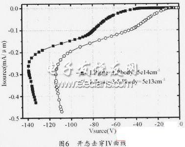 通过以上分析,发现提高nLDMOS的开态击穿电压较有效的方法是缩短栅极场板和提高体区注入剂量。这二种方法的实质提高导通阻抗或降低电流能力。但是对于普通应用的nLDMOS,电流能力本身就比pLDMOS有优势。当应用到负电源电平位移电路中时,厚栅氧高栅源电压使得nLDMOS的电流能力更加突出,但是同时也导致了开态耐压的降低。所以提高nLDMOS开态击穿电压就必须降低其电流能力。如图6所示,在nLD-MOS正常工作时,源端的电压为-100V,此时饱和电流相差0.05mA/μm。