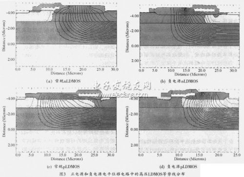 电源的改变不仅仅改变了电路的结构,nLDMOS的厚栅氧,同时器件的耐压机理也发生了改变。考虑到低压管的背栅效应,SOI材料的衬底只能接地,因此源漏电平的改变将引起nLDMOS和pLDMOS耐压机理的改变。图3是利用工艺(Tsuprem4)、器件(Medici)联合仿真得到的正电源和负电源电平位移电路中高压nLDMOS和pLDMOS关态击穿时等势线分布对比图。对于nLDMOS,常规正电源应用的衬底电位对于漂移区来说是辅助耗尽作用,这就是常规SOI中的RESURF原理。但是对于负电源的nLDMOS来说,衬底不再起辅助耗尽SOI层漂移区的作用(图3(b))。对于pLDMOS来说,情况刚好相反。所以针对负电源应用,两种器件都要进行相应的优化处理。