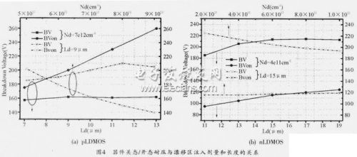 图4 (b)为nLDMOS在漂移区注入剂量Nd=4e11cm-2时关态耐压、开态耐压与漂移区长度Ld(μm)的关系,以及在漂移区长度Ld=15μm情况下关态耐压、开态耐压与漂移区注入剂量Nd(cm-2)的关系。其他参数为:p型体区注入剂量5e13 cm-2,Psink注入剂量3e15 cm-2,N-buffer注入剂量1e13cm-2,沟道长度3μm,栅极场板3.5μm。相对于pLDMOS,漂移区注入剂量和漂移区长度对于开态耐压、关态耐压的影响不大。同时关态耐压都能维持在180V以上,但是开态耐压却只有90~120V,不能满足8~100V工作电压(108V耐压)的要求。nLDMOS开态耐压问题成为电路、器件设计的关键。