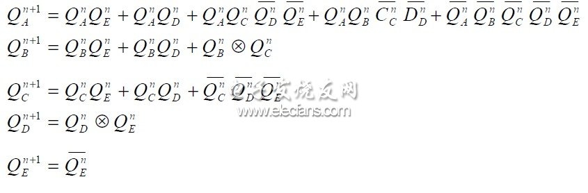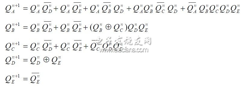 变模分频器的基本原理是设置一个符合函数,在分频过程中,触发器的输出与预置模比较,当触发器的输出与预置模一致时,则给出符合信号,强迫计数器进入所希望的状态,即初始状态,随后计数器则按照卡诺图确定的程序继续工作,直到较后一个状态,即由地址码确定的第N-1 个状态,再强迫分频器回到初始状态[3]。所以每个触发器应当受到两个控制函数的控制,即: