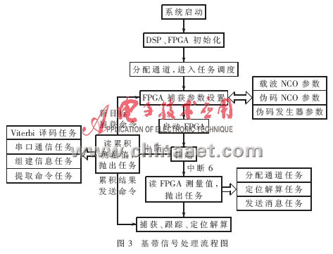 整个无源定位算法的实现分为FPGA处理单元和DPS处理单元两个部分,FPGA实现六路并行的数字接收通道(北斗一号有三颗卫星六个波束)完成载波剥离、接扩、积分累加以及伪距、载波相位等基本观测量的提取等。DSP主要完成伪码捕获、载波和伪码跟踪环路的滤波以及数据解调、位同步、帧同步等算法和整个软硬件的协调功能。为了使如此之多的模块能够顺利运行,在DSP的主程序中采用了任务调度的机制,以两个中断时间间隔为基准,根据信号处理的流程在不同时刻抛出各种不同的优先级的任务,主程序不停地查询任务队列,如果队列中有多个任务等待处理,则取出优先级高的进行处理。整个信号处理的流程如图3。系统上电后首先进行DSP和FPGA的初时化,然后对一颗卫星某个波束进行处理通道分配,DSP程序进入任务调度状态,FPGA根据设置的载波NCO参数、伪码NCO参数产生本地复制的卫星信号,将该复制信号同实际信号进行相关累积运算,31.25μs后产生5号中断通知DSP某一通道中存在新的累积值,同时FPGA重新开始下一个相关累积运算,DSP得到新的累积值后开始顺序进行捕获、跟踪和定位解算,同时抛出Viterbi译码、串口通信、组建导航信息和提取命令四个任务;31.25ms后产生6号中断通知DSP读取伪距、载波相位等观测量,同时抛出分配通道、定位解算和发送消息任务。整个系统在DSP的调度下循环往复运行。
