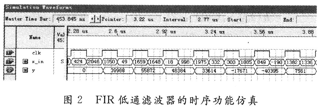 由于直接将大量数据进行硬件仿真验证很不方便,因此利用Matlab产生一个采样频率为100 MHz,频率分别为1 MHz与30 MHz的两个正弦信号相加后,作为输入信号。vec文件,导入到QuartusⅡ中进行仿真,时序功能仿真结果如图2所示。