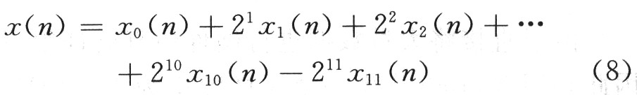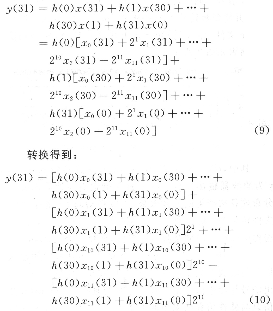 具体FPGA实现时,首先将12位的输人数据并行输入到12列32位移位寄存器分别寄存,然后以寄存器中的值为地址,对应于查找表的结果,按照式(10),每列进行相应二次幂加权,较后各列累加,在第32个数据完全输入之后得到正确的滤波器输出。可以将32位的查找表划分为四个8位的查找表,从而降低对ROM的需求。