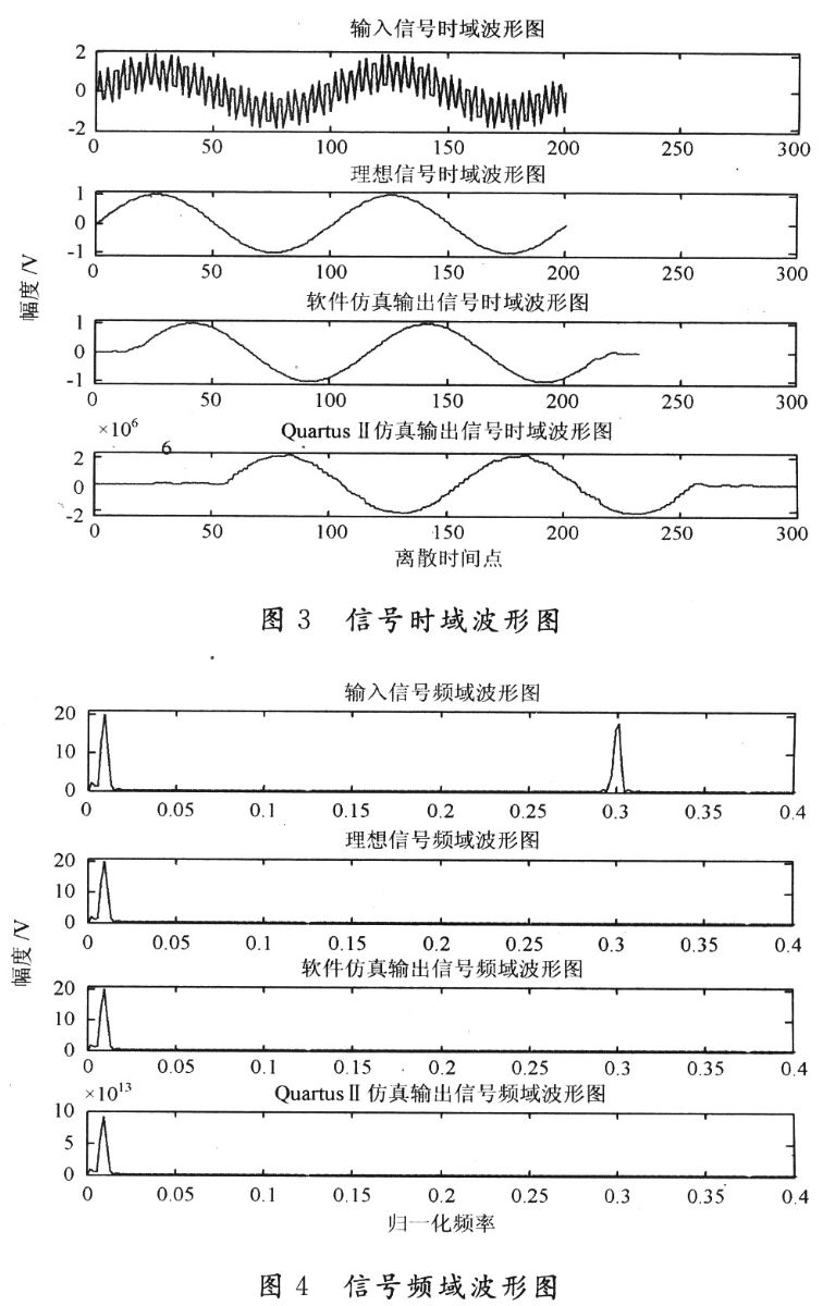 图3,图4中,软件仿真是直接在Matlab中用输入信号与滤波系数卷积得到的,在时域波形中软件仿真输出信号与理想信号相比有一定时间延迟,而QuartusⅡ仿真与软件仿真结果中幅度的差别是由于硬件输入量化产生的。
