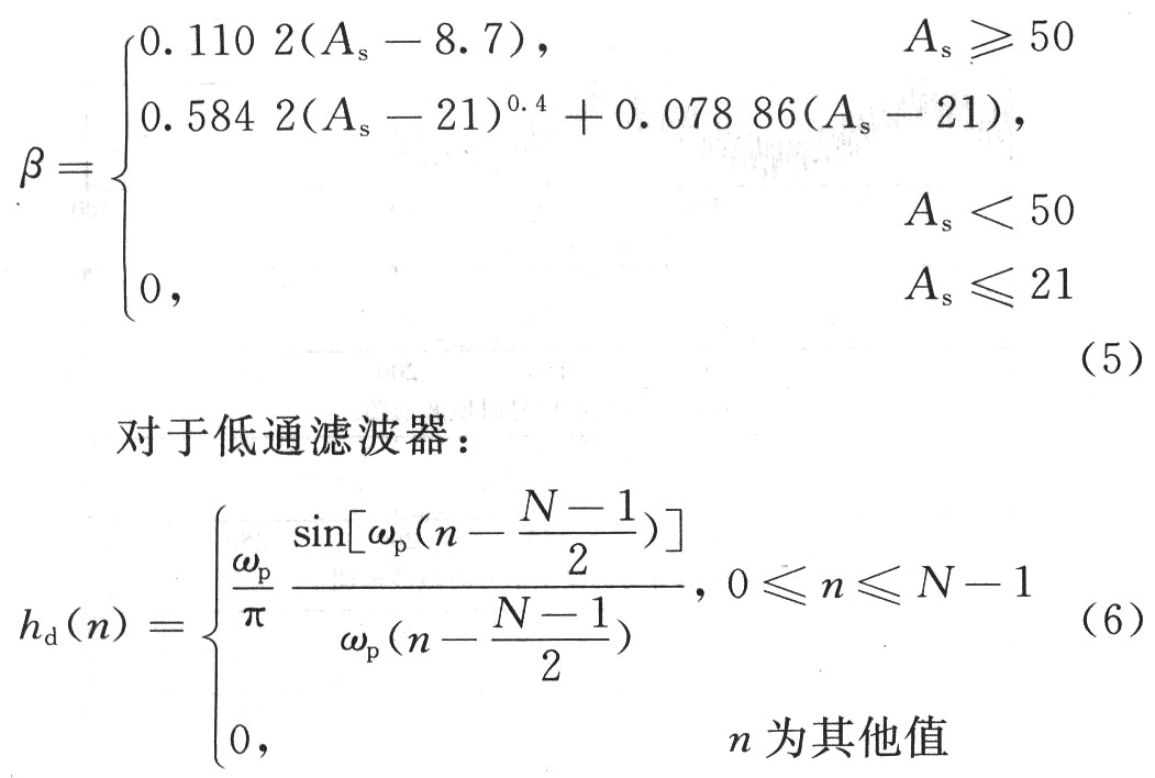 I0[·]为第一类变形零阶贝赛尔函数,形状参数β为依赖于滤波器阶数M的参数,用来调整主瓣宽度与旁瓣衰减,选择M可产生各种过渡带宽和接近较优的阻带衰减。给定通带截止频率ωp,阻带起始频率ωs,阻带衰减As,凯泽窗设计中有经典公式可供使用,如下: