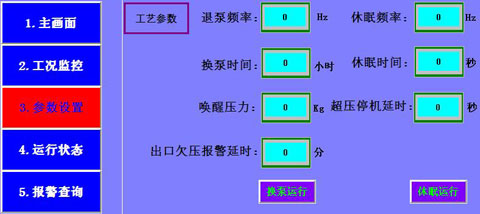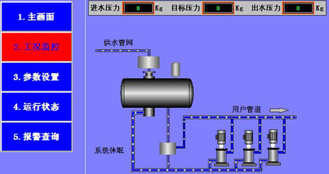 无负压供水控制系统操作界面由触摸屏HT6720T制作。操作界面主要可以完成无负压供水控制系统运行工况的监视、系统运行参数设置、实时报警显示、历史报警显示等功能。触摸屏工况界面如图3所示,可以查看各个水泵的运行状态以及进水压力、目标压力和出水压力等几个重要的输出参数。