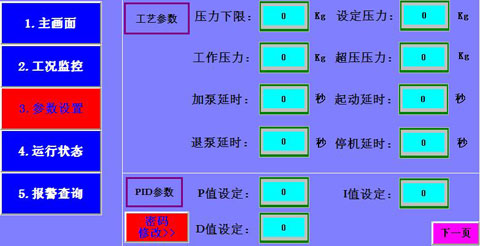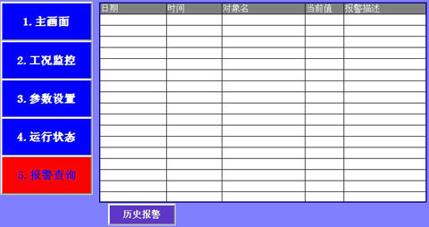 图4和图5是参数设置界面,可以进行系统参数的设置。所设置的参数均为掉电保持。LM系列PLC中掉电保持区的数据为永久保持,可以避免因停电导致系统设定参数丢失的后顾之忧。图6为触摸屏报警查询画面,可以查询实时报警和历史报警信息。