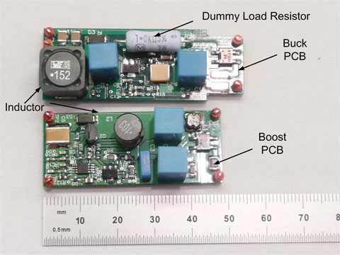 图 4 为图 1-2 示意图所描述电源的照片。即使这种电源产生的输出功率大致相同,但也存在一些影响电源尺寸的明显差异。升压电源的电感器尺寸明显更小,因为其蓄能要求更低。相比升压电源,降压电源有一个更大的电阻器。该电阻器为一个仿真负载电阻器(图 2 所示 R20),用于决定调光器何时开启硅控整流器 (SCR)。需要这样做的原因是,调光器在三端双向可控硅开关组件旁边有一个电磁干扰 (EMI) 抑制电容器,其在无负载情况下的电压相对电源要高。这样便扰乱了电源,导致出现不稳定调光。使用升压电源时却不需要这样做,因为 LED 通过升压电感器连接至输入,为其提供足够负载,因此上述问题便不是问题。图中未显示电路板的背面,但正如示意图所示,降压电源有更多低电平电路。所以,升压电源拥有更低的功耗,这一点在诸如 LED 灯泡更换等空间限制型应用中极为重要。