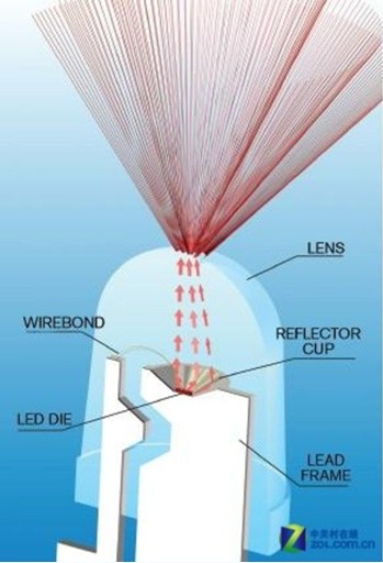 LED大量应用要求是圆柱、圆球封装,由于凸透镜的作用,故都具有很强指向性。