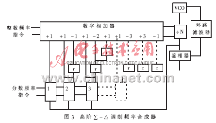 ∑-△调制频率合成器是一个无相位补偿的分数频率合成器,用∑-△调制器取代普通分数环中的累加器。把所需分频比的分数部分作为∑-△调制器的输入,由调制器产生脉冲密度调制信号去控制频率合成器的分频比,以达到分数分频的目的。具有1位量化器(比较器)的一阶∑-△调制器如图1所示。1位D/A变换器完全线性,引入量化噪声e(k),则量化器可作线性化处理,得图1线性化模型,其中k为整数,g(k)为0~1的分数,代表小数分频分频比的小数部分。y(k)为0或1,分别代表分频比为N和N+1的情况。理论分析表明[1],一阶∑-△调制器对信号是全通的,能传递所需信号。此外,它对噪声呈现低频端抑制大、高频端抑制小甚至放大特性。这就是∑-△调制器的噪声变形特性,它把噪声能量推向高频端,而高频噪声可由环路低通滤波器滤除,因此一阶∑-△调制频率合成器具有较小的噪声。为更好地抑制噪声,可用高阶∑-△调制器,它由多个一阶∑-△调制器级连而成。级连的方法如图2所示。第一级的量化噪声e1(k)(由v1(k)与y1(k)差得到)e2(k)作为第二级的输入,第二级的量化噪声e2(k)作为第三级的输入,各级输出作如图的处理。调制器的输出用来控制分频比。高阶∑-△调制频率合成器电路实现框图如图3。采用多级累加器结构,与小数分频频率合成器比较,∑-△调制频率合成器利用3个累加器或更多个累加器代替单个累加器,每个累加器的输出与下一个累加器的输入相接。和通常的分数环一样,累加器的溢出控制分频比。第一个累加器同分数系统中的累加器以同样的方式工作,它溢出时,在一个周期内,将分频比从N变到N+1。第一个累加器的输出代表相位误差,如不进行其它修正就会产生相位误差。这个输出再次由第二个累加器进行数字积分,由它的输出进一步控制分频比。控制方法如图2所示。第二个累加器的溢出使分频比变为N+1,下一时钟周期变为N-1;第三个累加器将分频比变为N+1,N-2,N+1;第四个累加器将分频比变为N+1,N-3,N+3,N-1等等。