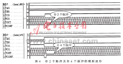 本设计的软件环境为Xilinx 公司Foundation Serials 1.5i。采用原理图输入的设计方法,将复杂的原理图分块放在同一设计项目中,输入完毕后进行功能模拟,确认功能正确以后,对原理图进行编译并进行FPGA器件内部的布局布线,同时生成定时模拟数据文件。功能模拟主要是验证三级∑-△调制器的功能是否正确,判断的依据是看其是否可实现吞掉1~8个脉冲。图4是功能模拟的部分波形图,采用XC3064A-7-PC84芯片对设计进行布局布线,结果使用资源情况为CLB 86%、IOB 27%、GCLK被使用。较高工作频率为4MHz。定时模拟能够保证功能正确。