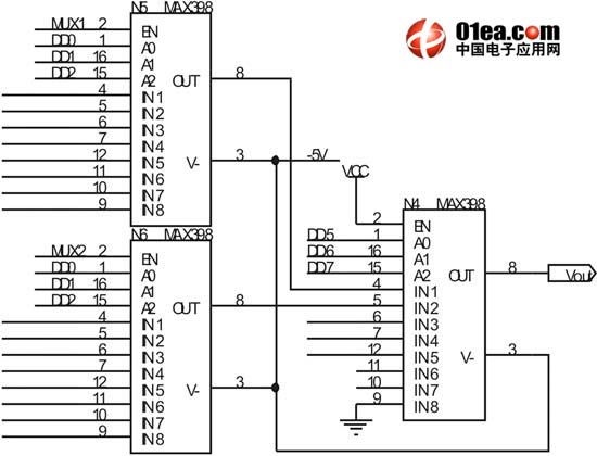 信号MUX1~MUX5是MUX电路的前级芯片选择信号,高电平有效;DD0~DD2是MUX电路前级的通道选择信号,取值范围是0~34,对应模拟通道的1~35;DD5~DD7是MUX电路的后级通道选择信号,取值范围为0~4,分别对应前级的五个MUX的输出信号。这些信号的产生过程是:单片机通过数据线D0~D7将通道选择数据及芯片选择数据送到锁存器,产生通道选择信号DD0~DD2及DD5~DD7,再将部分数据进行译码产生MUX的片选信号MUX1~MUX5。