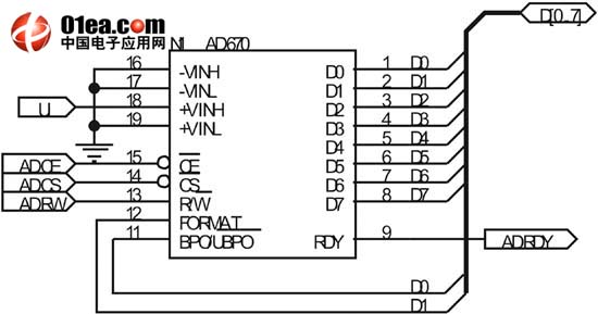 图4是A/D转换电路,主要功能是对输入的被测电压进行数据转换,转换的结果送单片机。A/D转换器件选用ADI公司的AD670,八位分辨率,10μs转换速度,可程控单极性或者双极性输入,单极性满量程输入范围为0~2.55V,双极性为-1.28~+1.27V,图中信号ADRDY为A/D转换完成信号,接单片机的I/O引脚,当ADRDY为低时,表示数据转换完成,在程序中通过查询该信号的状态判断A/D是否转换完成。信号ADCE、ADCS、ADRW分别是A/D的芯片使能、片选及读写控制信号,ADCE和ADCS低有效,分别接单片机的地址线P20和P21,ADRW为低时对A/D进行写操作,即写入控制命令,如单极性或者双极性操作等,ADRW为高时对A/D进行读操作,读出转换结果,该信号在CPLD中产生。