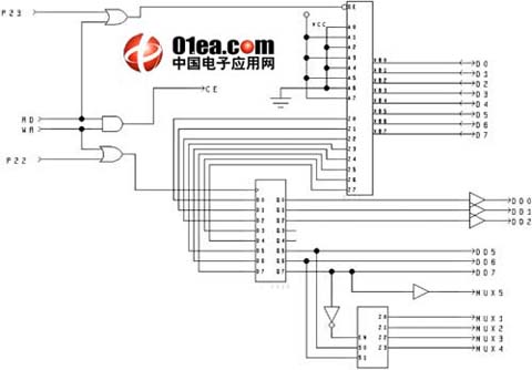 图6是CPLD内部逻辑电路,CPLD选用的是LATTICE公司的ispLSI1016E,逻辑设计采用原理图输入法,主要功能是对MUX的通道进行选择、对A/D转换器进行控制及产生自检代码等。图中有三个主要器件:数据双向开关、数据锁存器、译码器。数据双向开关的OE为低时,数据A0~A7传向单片机的数据线D0~D7,该数据正常时是自检代码AAH,当OE为高时,单片机数据传向CPLD内部的锁存器,用来对多路模拟开关进行选择。端口地址译码使用了单片机的RD、WR、P22、P23引脚,还使用了单片机的P20及P21引脚,它们分别连接到A/D转换器CS和CE端,具体地址定义如下: