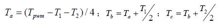对不同扇区的T1、T2,按表1 所示取值,还要对其进行饱和判断:如果T1+T2>Tpwm, 则T1= T1*Tpwm/(T1+ T2),T2= T2*Tpwm/(T1+ T2)。