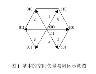 空间矢量脉宽调制SVPWM 实际上对应于交流感应电机中的三相电压源逆变器的功率器件的一种特殊的开关触发顺序和脉宽大小的组合。在采用三相逆变器对异步电机供电时,根据逆变器的工作原理可以知道,逆变桥共有23 =8 种状态,若将逆变器的八种状态用电压空间矢量来表示,则形成8 个基本的电压空间矢量,其中6 个非零矢量,2 个零矢量,每两个电压矢量在空间相隔60o,如图1 所示[2] 。SVPWM 技术的目的是通过与基本的空间矢量对应的开关状态的组合得到一个给定的定子参考电压矢量。