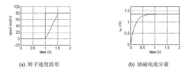 系统仿真结果如图4 所示。图4(a)所示是系统在额定负载条件下的转速阶跃响应波形。在t=1s 时刻前,系统处于静止励磁阶段,以建立额定转子磁通,如图4(b)所示。T=1s 时刻,系统转速给定由0 阶跃为80 rad/s ,该矢量控制系统的转速调节器迅速饱和,电机转速在较大转矩作用下以恒定加速度接近给定值,并在0.5s 内到达稳态,而且基本上没有稳态误差和超调。图4(c)所示为控制系统的转矩电流分量。图4(d)为定子电流A 相的电流波形。从仿真结果可以看出,该矢量控制系统的转速阶跃响应既没有超调,也没有稳态误差,而且在整个动态过程中,转子励磁电流分量基本保持不变,说明在负载扰动过程中矢量控制系统都能保持电机励磁电流分量和转矩电流分量的解耦控制,并具有良好的快速性。