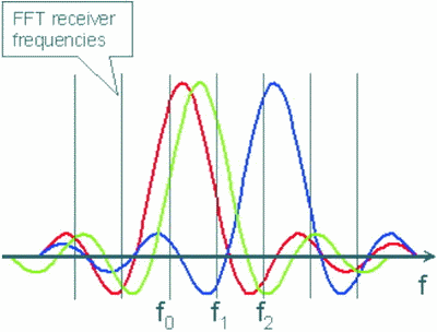 (5) 频率误差:频率误差可以用相对于频谱仪中心频率的载波频率误差来描述。收发信机间的频率误差将引起各个子载波频谱相对于接收机FFT频率的移动,产生载波间干扰(ICI),如图1所示。