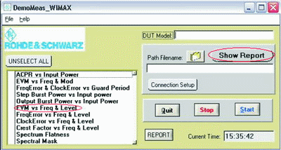 (3)外部PC软件DemoMeas_WiMAX:通过 GPIB 或 LAN 控制信号源(SMU200和SMJ100) 和频谱仪(FSQ和FSL) 。如图3所示,用户只需在左边栏目选择待测的参数,软件可自动完成测试所需的设置,而且同时生成测试报告。