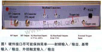 在设计新型无线设备的研发中,设计人员必须分析底层标准的各个方面。所有的无线规范都涉及射频和调制技术,通常具有基带和射频调制两大子系统。在研发过程中,这些子系统能分别进行独立的和综合的测试分析是非常重要的,因此,需要一个测试仪器能够分别发射和接收射频及基带信号。 这种面向系统的测试解决方案不需要像通用实验仪器那样提供许多控制按钮和开关,在面板上只有射频与基带输入输出端口(如图1所示)。应用基于PC的用户图形界面(GUI)软件系统,通过以太网卡接口,能够容易控制和操作测试系统。运行于PC上的分析软件大大降低了测试系统的成本,同时又保持了快速而全面的对信号捕捉和分析能力。