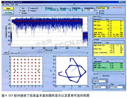 VSA和VSG都可以通过PC软件进行控制,利用GUI界面可以控制信号的带宽、功率、衰减等特性。对于VSA而言,GUI界面允许用户选择显示内容以及进行显示设置。例如,用户可以在一个窗口查看频谱、功率谱密度图和子载波星座图。部分或所有视图都可由用户自由选择,同步显示信号的多个信息。