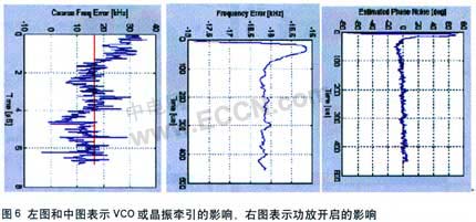 例如,当功率放大器上电的时候就可能会出现问题,功率放大器产生的电流将对晶振或者本地振荡器产生频率牵引。典型情况下,如果频率恢复得快,那么很有可能是本地振荡器受到牵引,但是当其恢复较慢的时候,则可能是基准晶振受到牵引。这里以实例说明图形化界面是如何帮助我们判断受到牵引的是晶振还是LO的(如图5所示)。