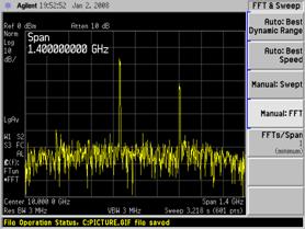 在采用同样窄的 RBW 设置时,FFT 频谱分析仪在测量频谱方面实际上比扫描分析仪更有效,尽管事实上分析仪仍然需要将几个计算的 FFT 部分的频谱进行“缝合”。例如,在 PSA 的FFT 模式下,当使用 1 kHz RBW 时,测量 1.4 GHz 频谱所需的时间是 91s,而在 PSA 扫描模式中所需的时间是 1688s。