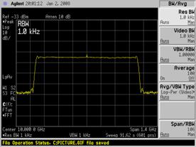 图 2 是对图 1 中所示的同一线性调频雷达的测量,这次使用的是 Agilent PSA 频谱分析仪的 FFT 模式,并采用不同的 RBW 设置。RBW 的默认值为 3 MHz时,我们只能偶尔捕捉到频谱。通过将 RBW 降低至 1 kHz,我们才能对频谱进行测量。但是,与图 1 所示的扫描模式下 100 ms 的扫描时间相比,现在,测量所需时间是 91s。另外,降低 RBW 还会降低脉冲灵敏度,从而导致较低的动态范围。将两图进行比较可知,本例中的扫描模式可达到 15 dB 以上的动态范围。有关脉冲灵敏度降低的解释,可参阅安捷伦雷达测量应用指南。[2]