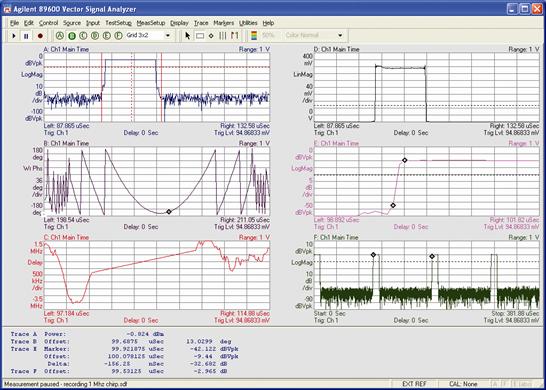 例如,由于矢量信号分析仪可以测量随时间和频率变化的信号的幅度和相位,因而可进行调制分析。图 3 显示的是使用连接至 Agilent PSA 频谱分析仪的 Agilent 89601A VSA 软件同时测得的雷达线性调频随时间变化的幅度、相位和频率响应。