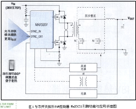 MAX5051为双开关拓扑PWM控制器,比较理想用于建立高性能、同步整流、48V隔离电源。见图1 MAX5051功能引脚与应用示意图。其元件数减少2倍而成本削减3倍。
