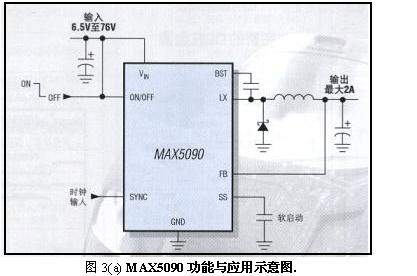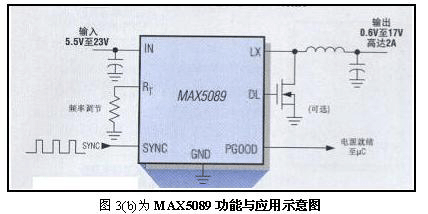 图3(a) MAX5090功能与应用示意图。其特征为:无需使用MOV或TVS;6.5V至76V宽输入电压范围;承受高达80V汽车甩负载;高性能,满载下具有92%的高效率,无负载时310μA低静态电流,19μA低关断电流;为严酷的汽车环境而设计,确保工作在-40℃至+125℃结温范围内,打嗝模式短路保护,保持器件凉态,热关断和短路限流。上述功能可整合在5mm X 5mmTQFN封装内。3.2频率较高并具有宽输入电压范围(5V至23V)的2A DC-DC转换器MAX5089见图3(b)示意。 其特征为:2.2MHz开关频率,避免噪声干扰 敏感的AM波段或ADSL2+频段;5V±10%或5.5V至23V的宽Vin范围,适合宽广的汽车电压范围和对xDSL和机顶盒的宽电压范围墙上适配器进行稳压及用于控制7V至14V的粗调中间总线电压非常理想;高效,同步整流驱动器允许在宽Vin范围内实现较高效率。 图3(b)为MAX5089功能与应用示意图。