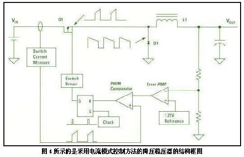 传统的电流模式控制方法有它的缺点。图4所示的是采用电流模式控制方法的降压稳压器的结构框图。稳压器的输出电压不但受监控,而且可与参考电压互相参照比较,一旦出现误差信号,便会传送到脉冲宽度调制器(PWM)。电压模式与电流模式的控制方式完全不同,原因在于两者的调制斜波信号来自不同的信号源。执行电流模式控制功能所需的调制斜波信号是一种与降压开关电流成正比的信号。电感器的电流会在开关导通期间流入降压开关。通电后,电感器电流的波形斜率为正数的(VIN—Vout)/L。降压开关电流的测量数值必须准确,而且有关数字要尽快测出,以便产生调制斜波信号。电流模式控制的主要缺点是很难取得降压开关电流信号。