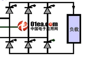 主路三相交流输入经过换相电感接到三个SCR桥臂组成的整流器之后变换成直流电压。通过控制整流桥SCR的导通角来调节输出直流电压值。由于SCR属于半控器件,控制系统只能够控制开通点,一旦SCR导通之后,即使门极驱动撤消,也无法关断,只有等到其电流为零之后才能自然关断,所以其开通和关断均是基于一个工频周期,不存在高频的开通和关断控制。