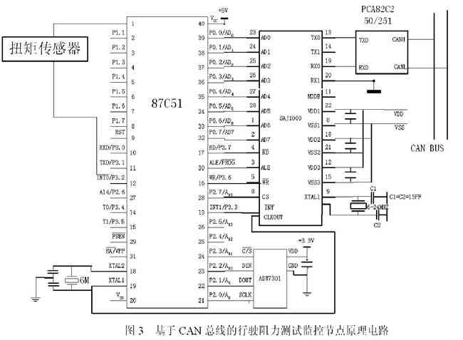 对于各个下位监控节点而言,通常可采用51 系列单片机作为该节点的监测信号初级处理中心装置,而用SJA1000 来做C A N 控制器,PCA82C250 则是一种常用的CAN 收发器和物理总线的接口,主要可以提供对总线的差动发送能力和对CAN 控制器的差动接受能力。采用上述三种元器件构成的一个下位监控节点的电路图形如图3 所示。