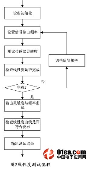 压电式爆震传感器的线性度检测主要通过连续改变振台的振动频率,即采用扫频的方式,将振台的振动加速度稳定在设定范围内,对各个频率下的传感器灵敏度进行检测,输出各个灵敏度与频率相对应的连续曲线,并检测该曲线是否符合该传感器产品的线性度要求,其测试流程如图2所示。