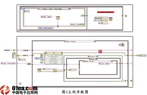 汽车爆震传感器测试系统的测控软件基于LabVIEW进行设计开发,主要采用状态机并行处理结构,同时将事件响应与数据流执行方式有机结合,使整个系统具有较高的稳定性、实时性和可靠性。主程序框图如图3所示。