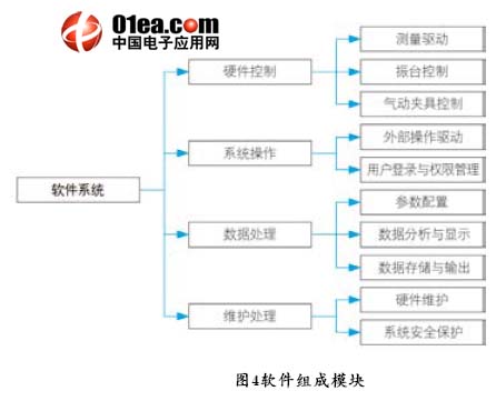 软件在功能实现上采用模块化的方式,特定的模块实现特定的功能,主要组成模块有测量驱动模块,振台控制模块,气动夹具控制模块,外部操作驱动模块,硬件维护模块,系统安全保护模块,用户登录与权限管理模块,参数配置模块,数据分析与显示模块,数据存储与输出模块等,如图4所示。