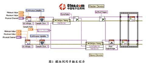 以一块主板卡、一块从板卡为例,以上同步触发工作通过LabVIEW编程实现的代码如图3: