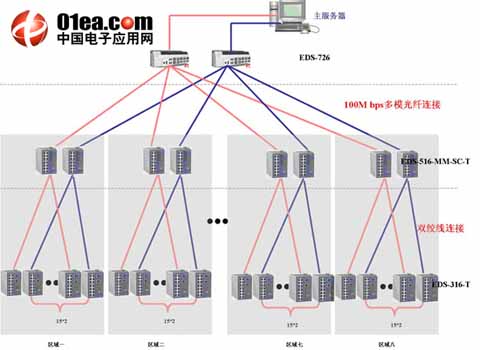 奥运场馆水立方艺术灯光景观项目的网络架构图所示:网络采用双网架构,分为三层。设备层由188台EDS-316-T交换机组成,主要负责连接现场的LED灯光控制器,控制景观灯的开关和颜色。汇聚层由16台EDS-516A-MM-SC组成,负责连接现场层的EDS-316-T。核心层使用两台EDS-726模块化交换机组成,负责连接汇聚层的EDS-516A-MM-SC和服务器。