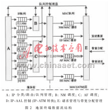 DVB-RCS的这种分类方法与上层IP数据流的分类方法必须要有一个映射关系,本文采用了参考文献[3]中提出的一种映射结构,如图2所示。实时数据流在IP层被划分到EF流中,在MAC层则依据一定的算法分为CRA和RBDC两部分;非实时数据流在IP层被划分至AF和BE两类,在MAC层则被划分到RBDC和VBDC当中。本文主要针对RBDC/VBDC两类请求研究合理的带宽请求算法,在DVB-RCS中也就是在每个超帧中申请一定数量的业务时隙。