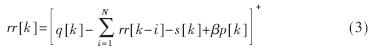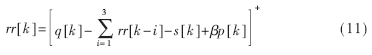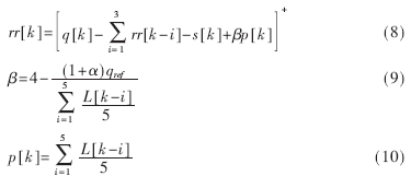 (3)式中,rr[k]为第k次申请的时隙数,q[k]为当前MAC队列长度,s[k]为下一个超帧将要占用的时隙数,p[k]为第k次到第k+1次申请之间到达队列的数据包数的预测值,参数?茁用于控制队列长度。