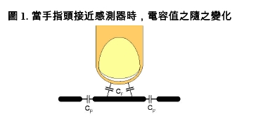 电容式传感器是由导体片、接地面、与控制器所构成。在多数的应用中,导体片会用一片铜制电路板,而接地则用灌注填充。这两者之间存在有原生(寄生)电容(CP)。当其它如手指头等导电物体接近传感器时,随着该物体的电容值(CF)增加,系统的电容值也随之增加。(如图1)