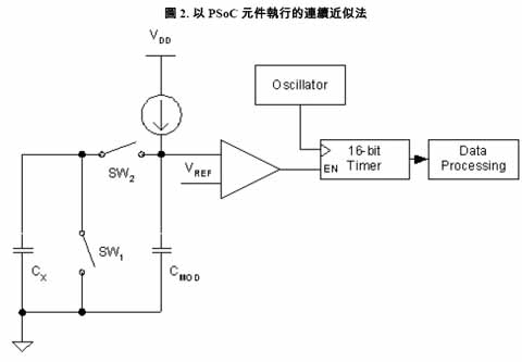 以PSoC 组件执行的连续近似法(Cypress 申请之专利)采用一组电容对电压的转换器以及单斜率模拟数字转换器(ADC)。其电容值量测方式是先藉由将电容值转换至电压值,接着将该电压值储存于电容器内,然后再利用可调式电流源来量测所储存之电压值。其中电容值对电压值转换器乃是利用切换式电容器技术,此电路系统让传感器电容器可依其电容值反映出对应的电压值。切换式电容器所用的频率则是由PSoC 本身内部的振荡器所产生。