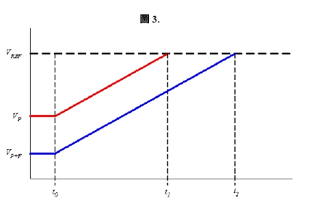 计算所得的iDAC 值接着再度用来对总线充电,并且测量总线从初始电压到比较器的临界电压所需的充电时间。初始电压是在没有手指触碰的情形下,因此充电时间可事先测定。当手指触碰传感器时会增加CX 的值,并且降低初始电压,因此会延长充电时间量测。(如上公式及图3)
