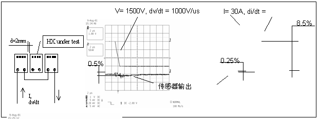 对阶跃电流的超快速响应时间对IGBT短路保护必不可少。HX系列可以以50A/ms以上的速度准确跟踪电流变化,对阶跃电流的响应较快为3ms。