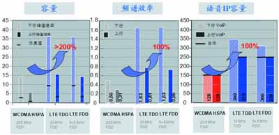 前面的章节中已经就系统评估的指标进行了相应的描述,从容量,频谱效率以及VoIP的容量等几个方面来讲,无论是LTETDD和LTE TDD较之3G系统(如3GWCDMAHSPA,TD-SCDMAHSPA等)有较大的提升。