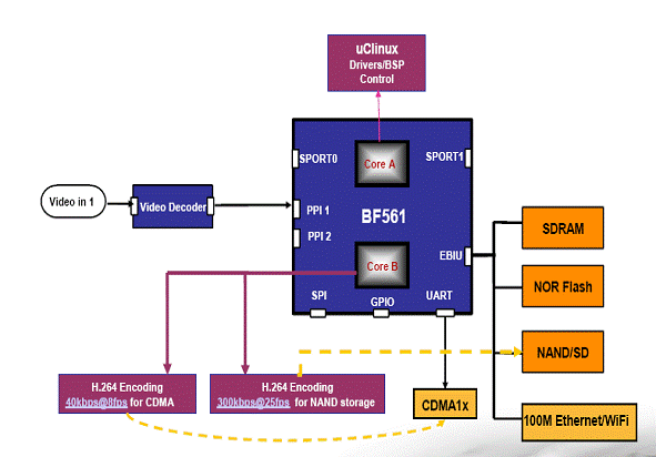 ADI公司嵌入式处理和数字信号处理第三方开发金牌合作伙伴合肥优视科技目前可提供基于ADSP-BF561的单路CDMA/EDGE/TD-SCDMA/WCDMA/WIFI无线H.264视频监控产品成熟方案。如图3所示,该方案通过一个DSP内核实现了独特的双码流处理,支持闪存盘数据的备份;另一个DSP内核则用于运行uClinx操作系统、驱动程序和BSP控制软件。