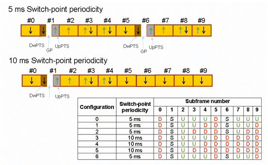 TD-LTE指定的频率范围是1850到2620MHz,并且使用与FDD相同的MIMO情形和上下行调制制式:下行为OFDMA(Orthogonal Frequency Division Multiple Access),上行为SC-FDMA (Single Carrier Frequency Division Multiple Access)。如下图所示,TD-LTE使用两种帧结构,每个帧包含10个子帧,长度为10ms。