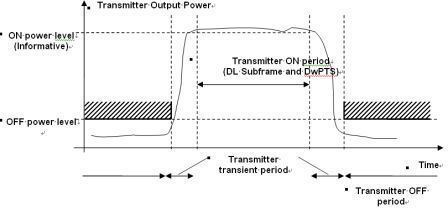 较初的测量目的是确保发射和接收不受损伤:包括上行和下行发射模板,较大和较小功率,功率控制。定义邻道泄漏和发射杂散用于确保较小的干扰。下图是发射打开/关断模板的例子。